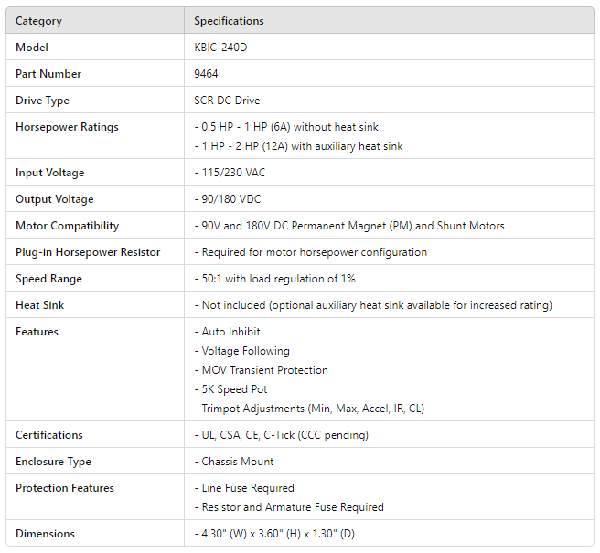 9464, (KBIC-240D) SCR DC Drive 1Hp-2Hp 12A With Heat Sink 0.5Hp-1Hp 6A Without Heat Sink 115/230VAC 1PH Input 90/180VDC Output Chassis is backordered and will ship as soon as it is back in stock.