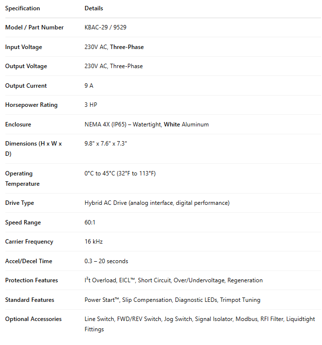 9529, (KBAC-29) Hybrid AC Drive 3Hp 9A 230V 3PH Input 230V 3PH Output NEMA 4X Enclosure - White is backordered and will ship as soon as it is back in stock.