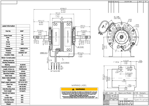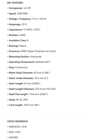955P, OEM Replacement, 1/6Hp, 1500 Rpm, 115V, 60 Hz, CWLE, OPAO