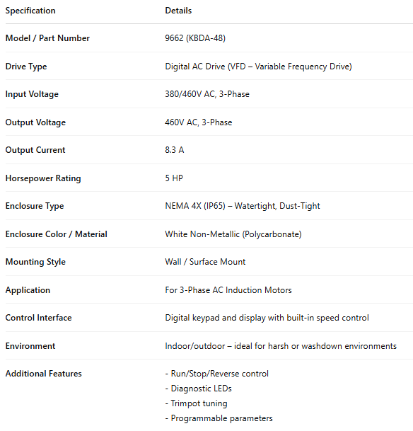 9662, (KBDA-48) Digital AC Drive 5Hp 8.3A 380/460V 3PH Input 460V 3PH Output NEMA 4X Enclosure - White is backordered and will ship as soon as it is back in stock.