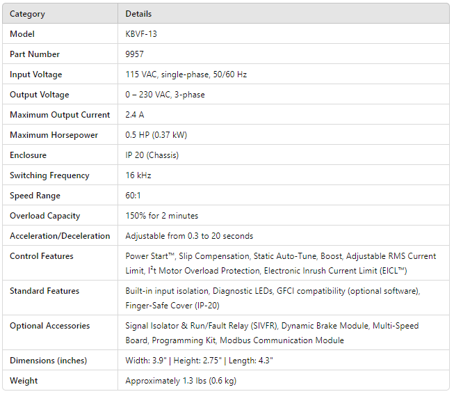 9957, (KBVF-13) Hybrid AC Drive 1/2Hp 2.4A 115V 1PH Input 230V 3PH output IP20 Chassis