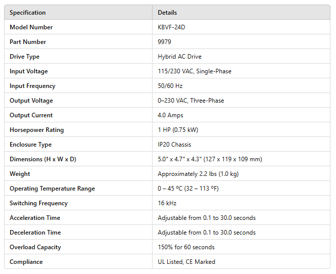 9979, (KBVF-24D) Hybrid AC Drive 1Hp 4A 115/230V 1PH Input 230V 3PH output IP20 Chassis is backordered and will ship as soon as it is back in stock.
