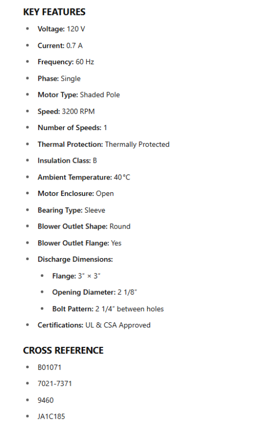 A071, FASCO, 7021-9987, 7021-7371, 120V, 3200 RPM, U21B, BLOWER ASSEMBLY
