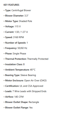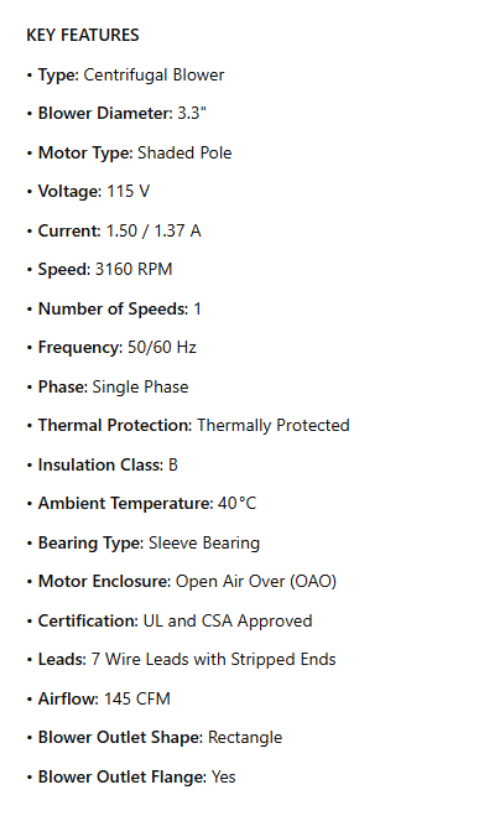 A166, Rectangular Outlet Shaded Pole Centrifugal Blower, 115 Volts, 3160 RPM, OAO, Flange: Yes
