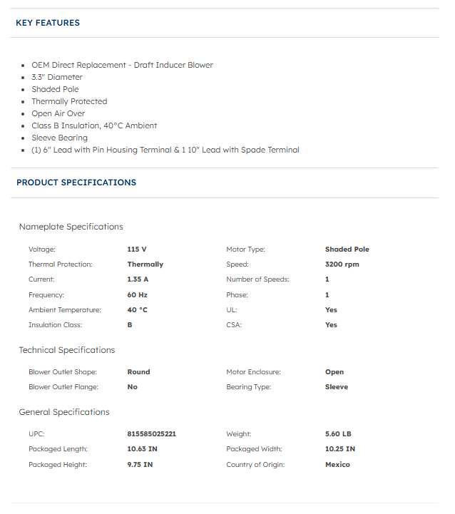 A196, Round Outlet Shaded Pole OEM Replacement Draft Inducer Blower, 115 Volts, 3200 RPM Flange: No is backordered and will ship as soon as it is back in stock.