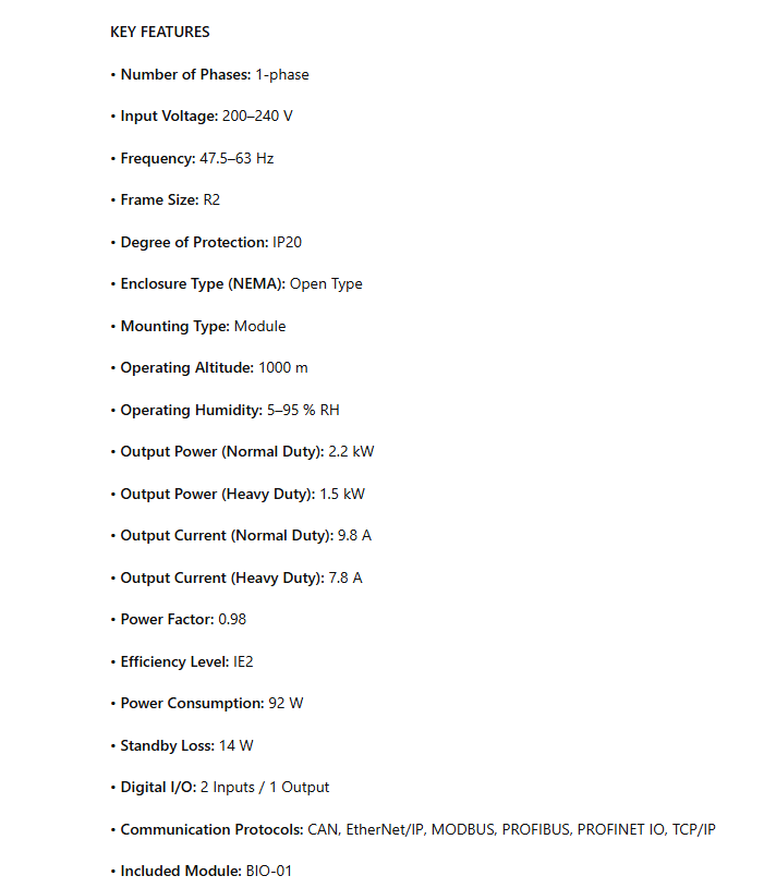ACS380-040N-09A8-1+BIO-01, AC machinery drive module, IEC: Pn 2.2 kW, 9.8 A, 230 V, UL: Pld 2 Hp, 9.3 A, 208 V , Frame R2, BIO-01 module