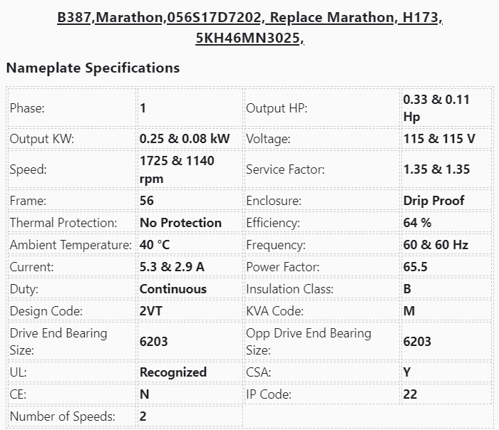 B387, Marathon, 056S17D7202, 1/3-1/6Hp, 1800 Rpm, Frame:56, 115 Volts, DP