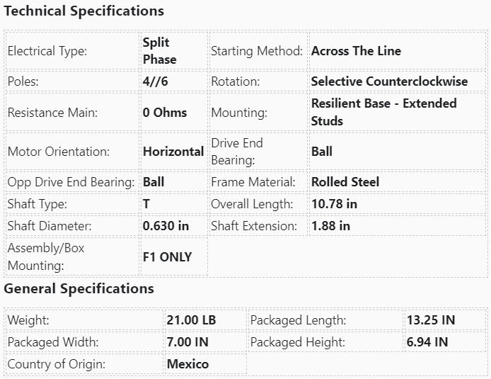 Phase: | 1 | Output HP: | 0.33 & 0.11 Hp |