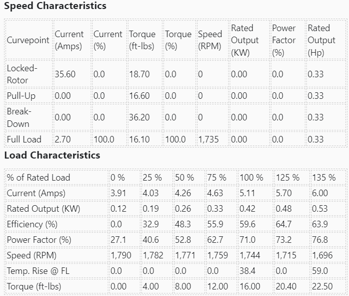 Curvepoint | Current (Amps) | Current (%) | Torque (ft-lbs) | Torque (%) | Speed (RPM) | Rated Output (KW) | Power Factor (%) | Rated Output (Hp) |