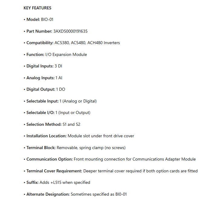 BIO-01, IO Expansion Module (3DI, 1AI, 1DO) for ACS380 and ACx480 Inverters (+L515)