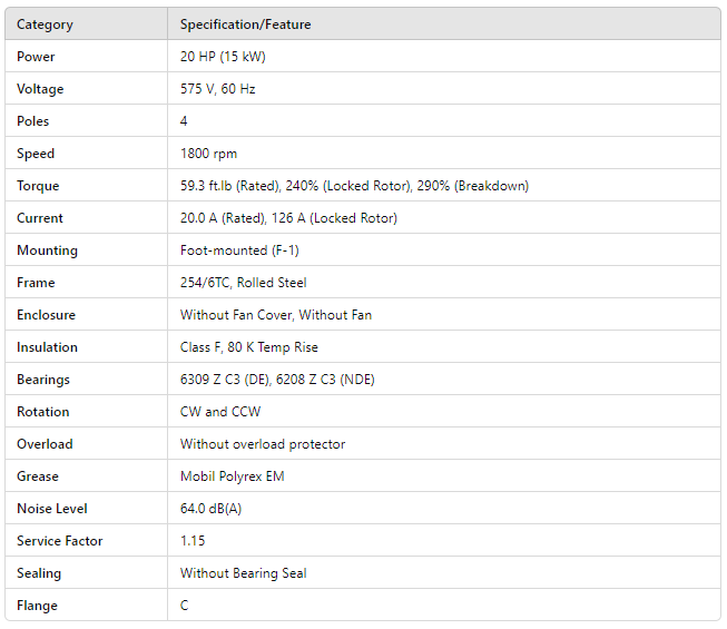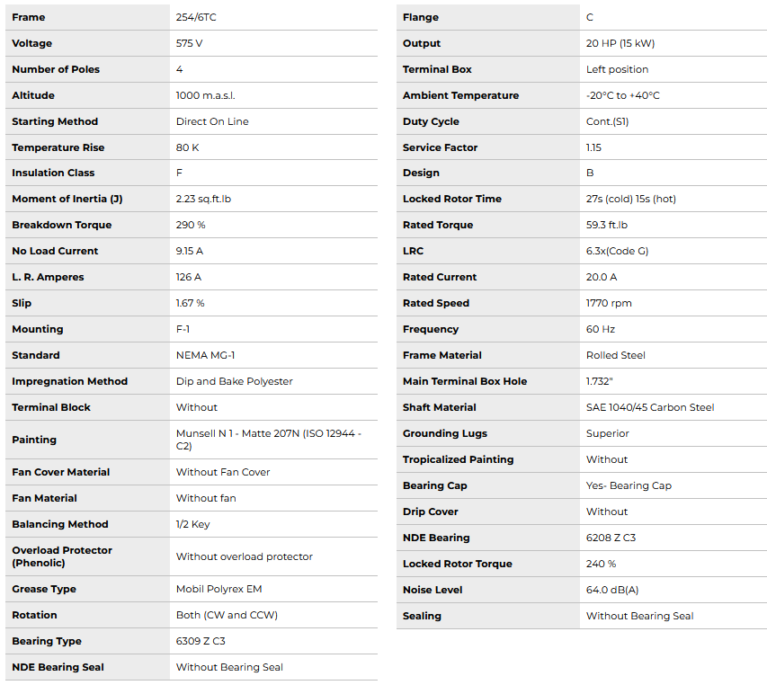 CP020504NPW01, Rolled Steel NEMA Premium Efficiency 20Hp 1770 Rpm 4P 254/6TC 3Ph 575 V 60 Hz IC01 - ODP - Foot-mounted