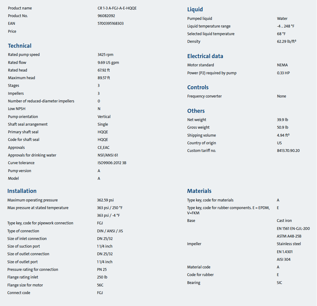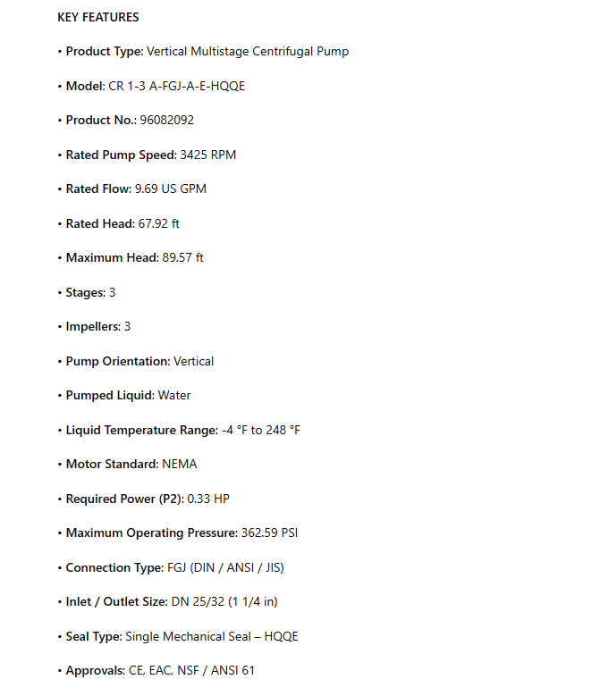 CR 1-3 A-FGJ-A-E-HQQE, Pump Without Motor, 1/3Hp, 3425 RPM, 56C, 9.69 US gpm, 96082092