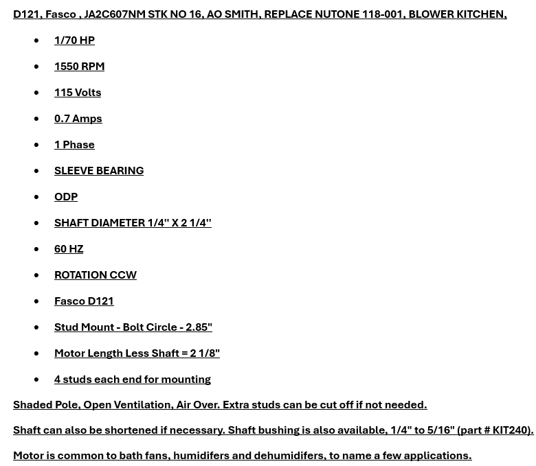 D121, Fasco, JA2C607R, Ao Smith, Nutone, 118-001A, 1/70 Hp, 1550 Rpm, 115V, 0.7A, CCW, is backordered and will ship as soon as it is back in stock.