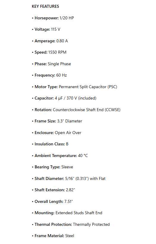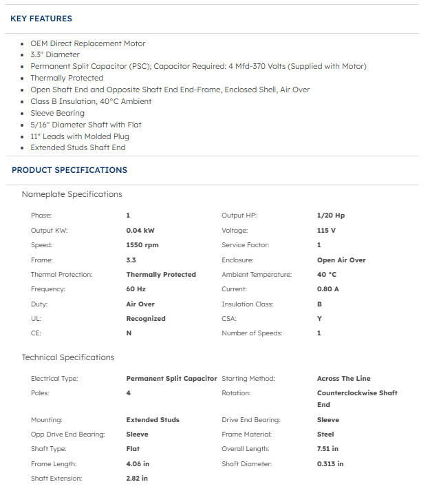 D1243, OEM Replacement Motor, 1/20Hp, 1 Ph, 60 Hz, 115 V, 1550 RPM, 1 Speed, 3.3" Diameter, OAO