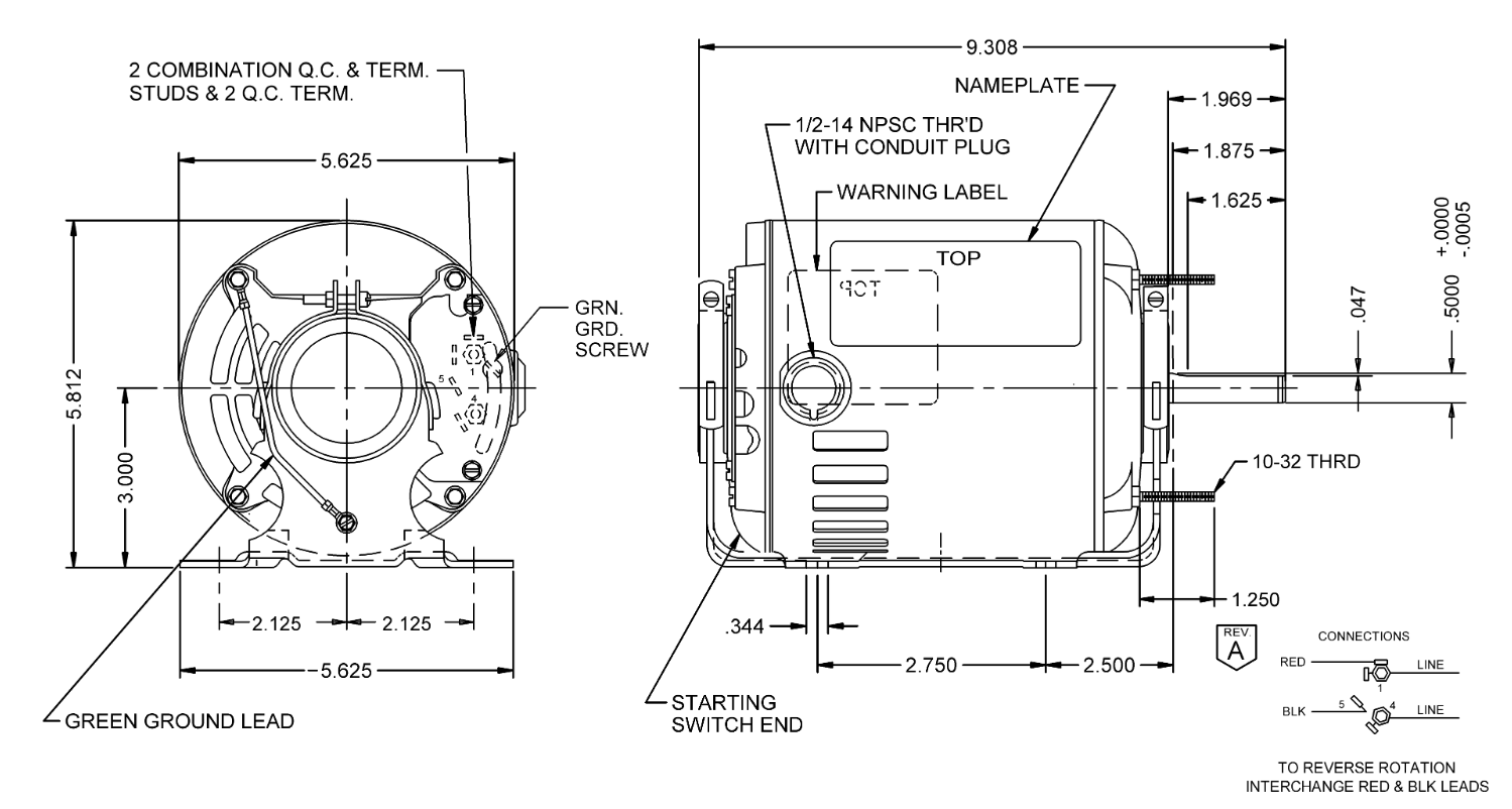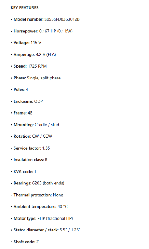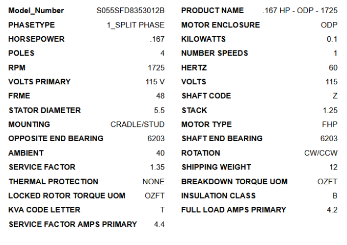 D16B2N4Z9, 1/6Hp, 1725 RPM, 115V, 1PH, 60Hz, Frame 48Z, ODP, S055SFD8353012B
