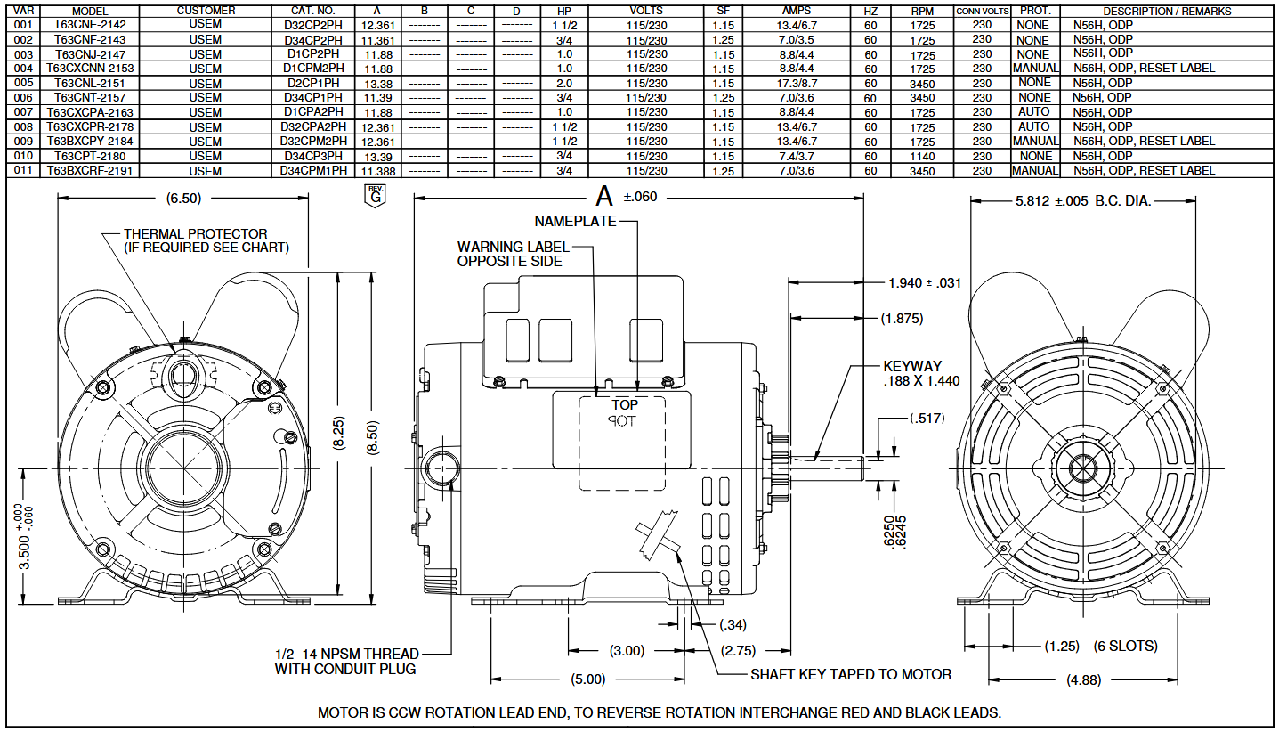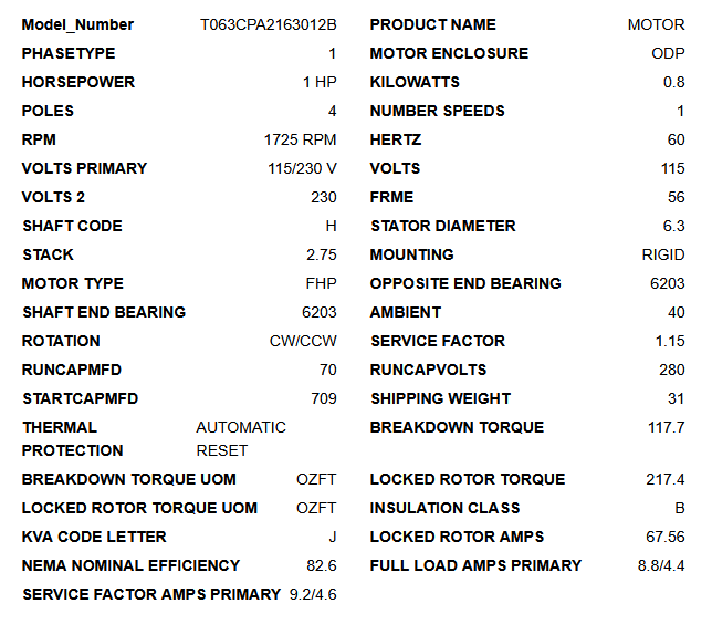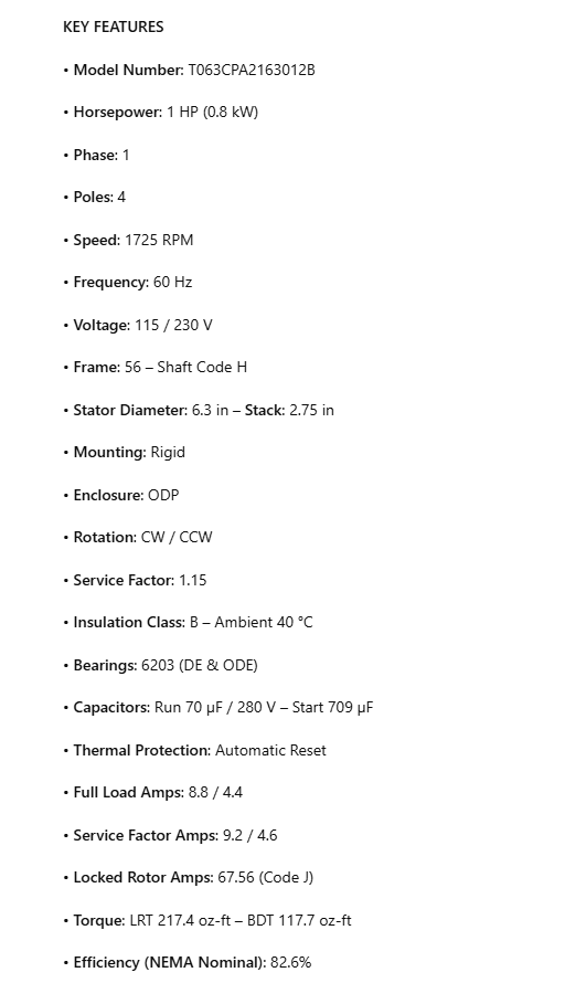 D1CPM2PH, General Purpose Capacitor Start, 1Hp, 1725 RPM, 115/230V, 1PH, 60Hz, Frame 56H, ODP, T063CNN2153012B