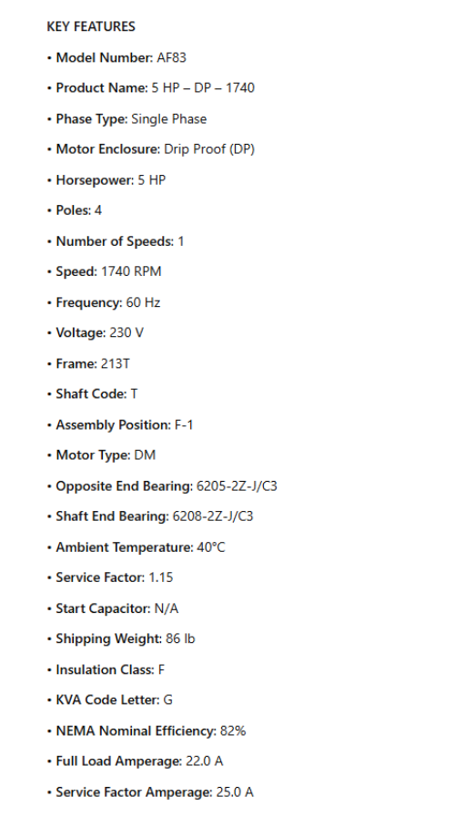 D5C2K21, 5Hp, 1740 RPM, 230V, ODP, 213T General Purpose Capacitor Start RIGID BASE NO OVERLOAD 1.15SF is backordered and will ship as soon as it is back in stock.