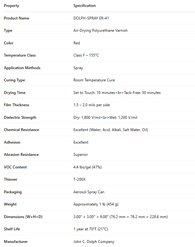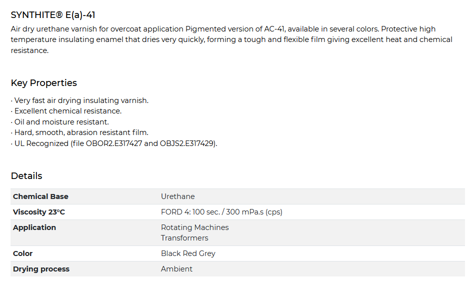 Red, high temperature, fast cure, air dry, polyurethane varnish. Excellent insulator coating for electrical/electronic parts.