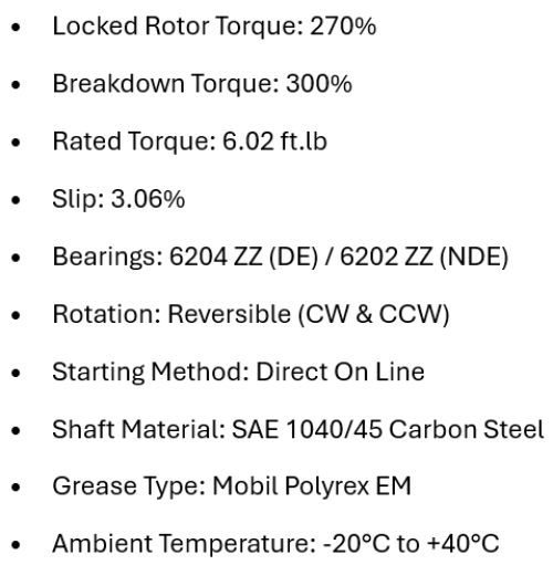 Bearings: 6204 ZZ (DE) / 6202 ZZ (NDE)