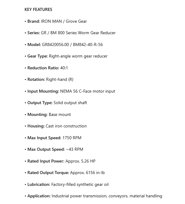 GR8420056,00 / BM842-40-R-56 *ratio 40: 1 R -56, GEARBOX IRON MAN is backordered and will ship as soon as it is back in stock.