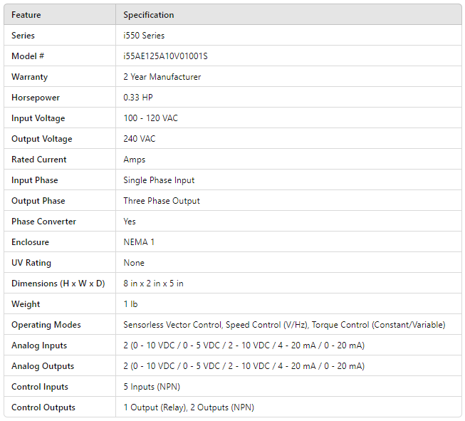 i55AE125A10V01001S, i550-C INVERTER 0.33Hp 1PH(i/p) 120V / 230V 3PH(o/p) / 1.7A (o/p) / 0-599HZ(o/p) / APPLICATION IO / IP20