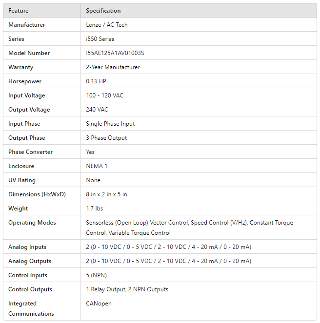 I55AE125A1AV01003S, i550-C INVERTER 0.33Hp 1PH(i/p) 120V / 230V 3PH(o/p) / 1.7A (o/p) / 0-599HZ(o/p) / STANDARD IO / MODBUS RTU / STO / IP20