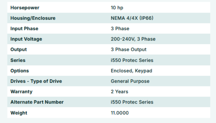 I55AP275C00701K00S, i550 PROTEC INVERTER 10Hp 3PH(i/p) 230V / 230V 3PH(o/p) / 29A(o/p) / 0-599HZ(o/p) / LCD KEYPAD / STANDARD IO / NEMA 4 IP66