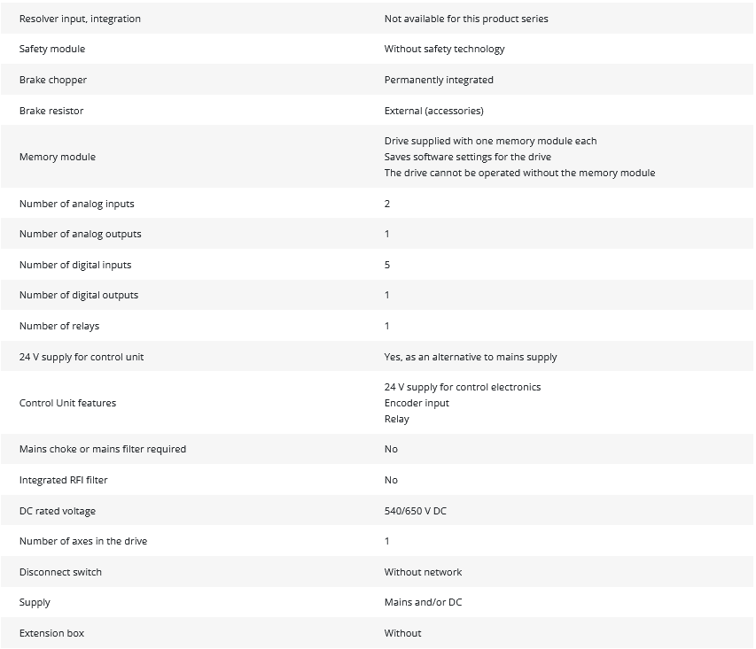 • Brake Chopper: Permanently integrated (external brake resistor available)