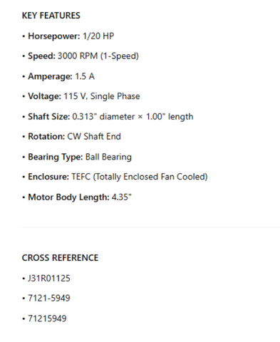 J31-01125, OEM Replacement, 1/20Hp, 3000 Rpm, 115 V, CWSE, TEFC