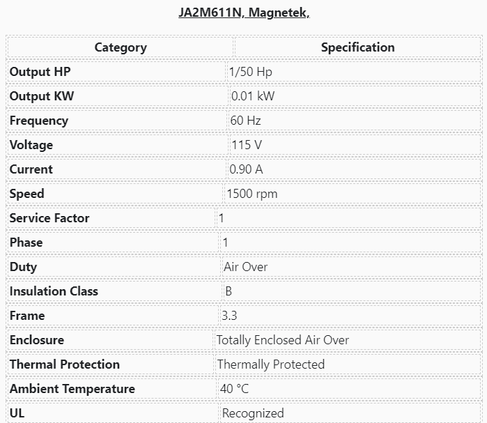 JA2M611N, Magnetek, 1/50Hp, 1550 Rpm, 115 Volts, Frame:3.3,TEAO,