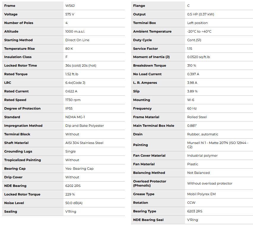 Torque 1.52 ft.lb (Rated), 229% (Locked Rotor), 310% (Breakdown)