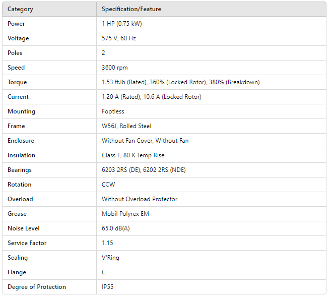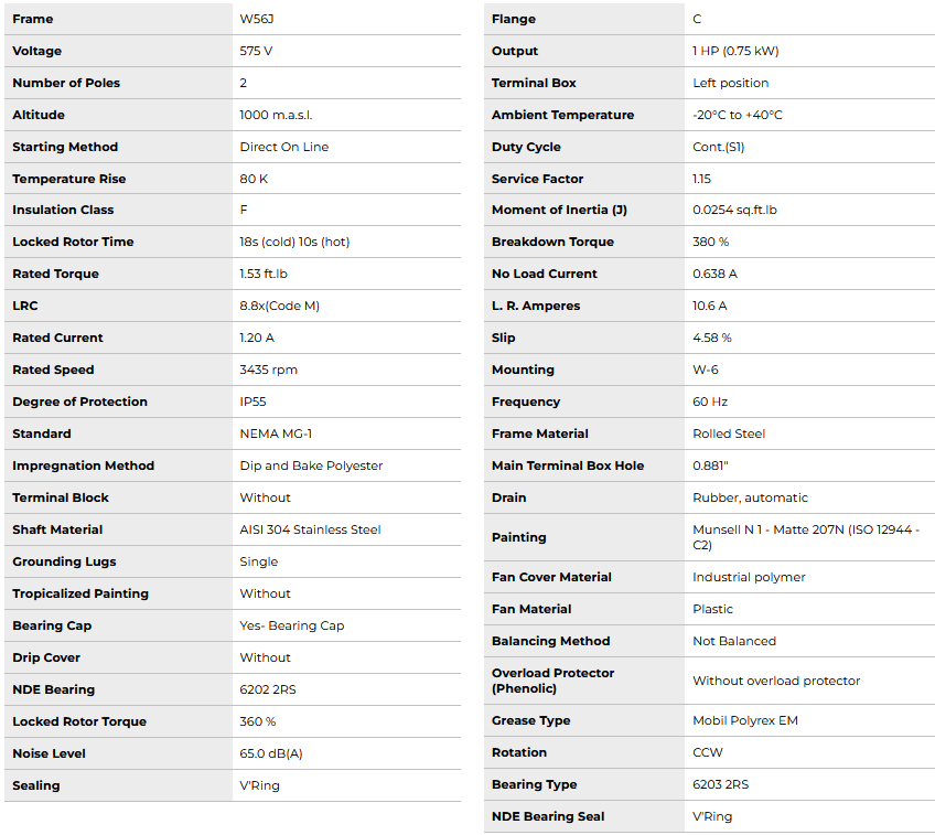 Torque 1.53 ft.lb (Rated), 360% (Locked Rotor), 380% (Breakdown)
