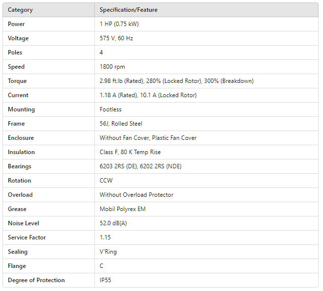 Torque 2.98 ft.lb (Rated), 280% (Locked Rotor), 300% (Breakdown)