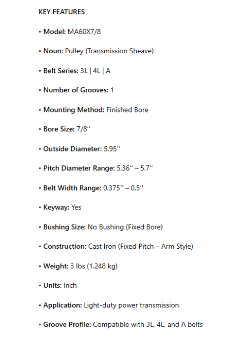 • Groove Profile: Compatible with 3L, 4L, and A belts
