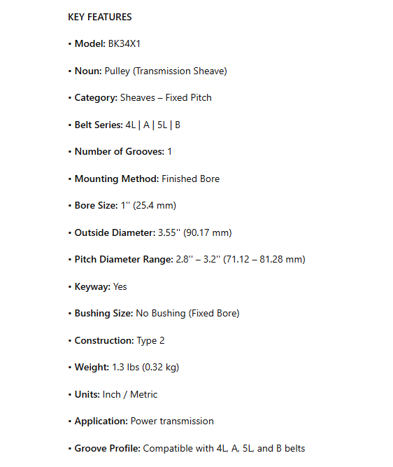 MB34X1, BK34-1, Transmission Pulley; 1" Bore; 1 Groove; 3.55" Outside Diameter; Finished Bore; No Bushing; 4L | A | 5L | B Belt Series; 2.8" Pitch Minimum; 3.2" Pitch Maximum; Keyway is backordered and will ship as soon as it is back in stock.