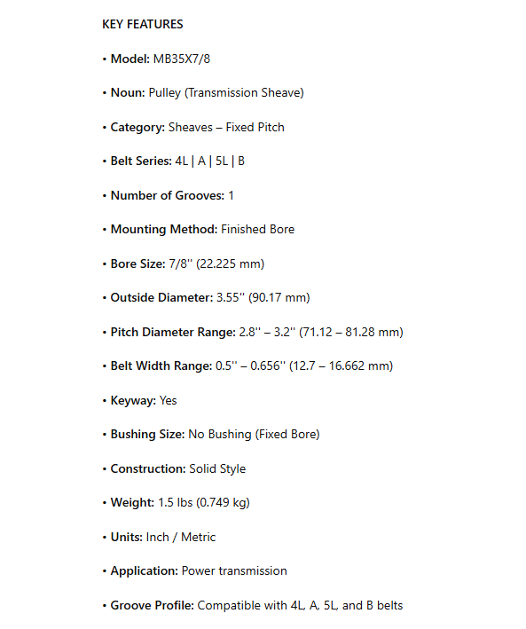 MB35X7/8, BK34-7/8, Transmission Pulley; 7/8" Bore; 1 Groove; 3.55" Outside Diameter; Finished Bore; 4L | A | 5L | B Belt Series; 2.8" Pitch Minimum; 3.2" Pitch Maximum; Keyway is backordered and will ship as soon as it is back in stock.