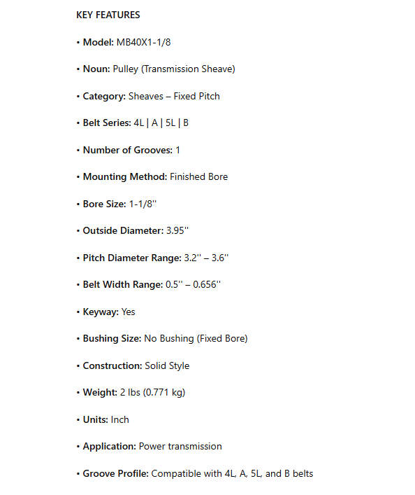 MB40X1-1/8, BK40-1/8, Transmission Pulley; 1-1/8" Bore; 1 Groove; 3.95" Outside Diameter; Finished Bore; 4L | A | 5L | B Belt Series; 3.2" Pitch Minimum; 3.6" Pitch Maximum; Keywa is backordered and will ship as soon as it is back in stock.
