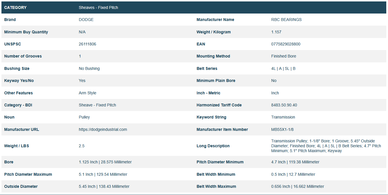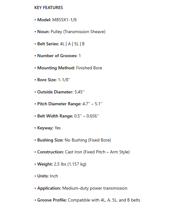 MB55X1-1/8, BK57-1-1/8, Transmission Pulley; 1-1/8" Bore; 1 Groove; 5.45" Outside Diameter; Finished Bore; 4L | A | 5L | B Belt Series; 4.7" Pitch Minimum; 5.1" Pitch Maximum; Keyway is backordered and will ship as soon as it is back in stock.