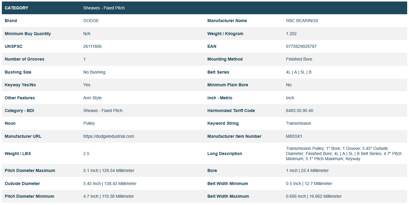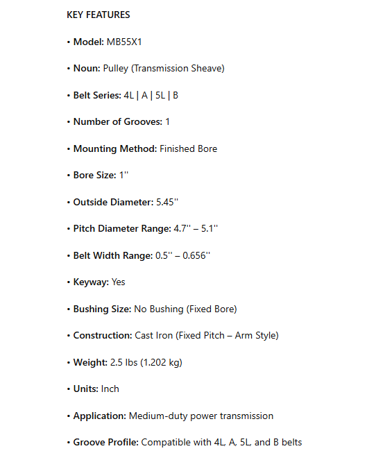 MB55X1, BK57-1, Transmission Pulley; 1" Bore; 1 Groove; 5.45" Outside Diameter; Finished Bore; 4L | A | 5L | B Belt Series; 4.7" Pitch Minimum; 5.1" Pitch Maximum; Keyway is backordered and will ship as soon as it is back in stock.