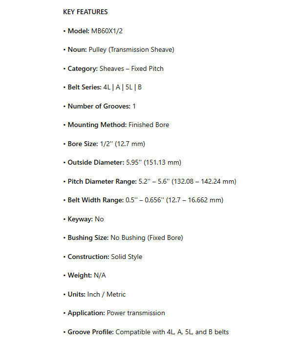 • Groove Profile: Compatible with 4L, A, 5L, and B belts