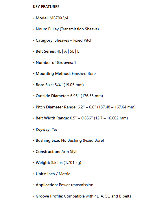 MB70X3/4, BK72-3/4, Transmission Pulley; 3/4" Bore; 1 Groove; 6.95" Outside Diameter; Finished Bore; 4L | A | 5L | B Belt Series; 6.2" Pitch Minimum; 6.6" Pitch Maximum; Keyway is backordered and will ship as soon as it is back in stock.
