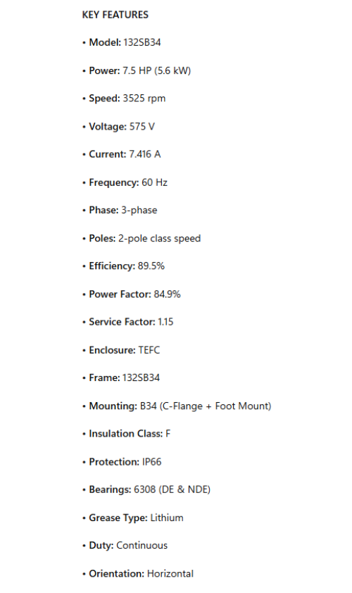 MPS-132S12FC-S3-B34, 7.5Hp, 3525RPM, 575V, 3Ph, 60Hz, TEFC, Frame 132S, IMB34, IP69K