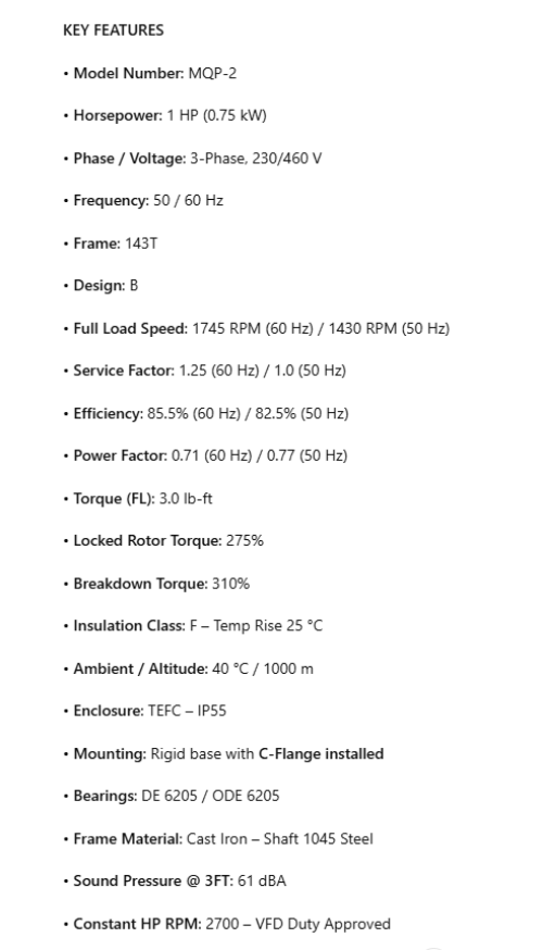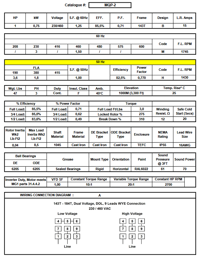MQP-2C, 1Hp, 1800 RPM, 208-230/460V, 3 Phases, 60-50Hz, Frame 143/5TC, IP55, CLASS F, 1.25SF