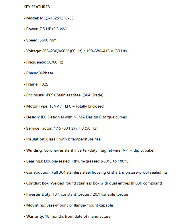 MQS-132S12FC-S3, 7.5Hp, 3600 RPM, 208-230/460V, 3Hp, 60-50Hz, TEFC, Frame 132S, IP69K