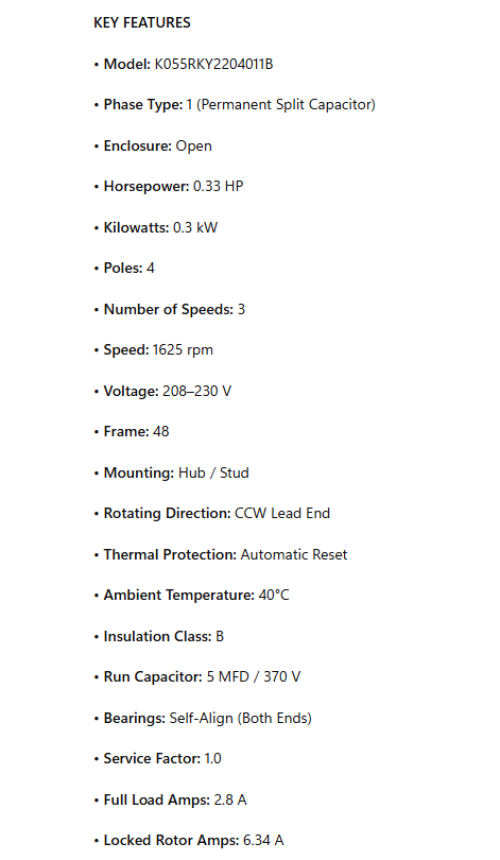 NA1034, 0.33Hp, 1625 RPM, 208-230V, 1Ph, Frame 48Y, ODP, K055RKY2204011B is backordered and will ship as soon as it is back in stock.