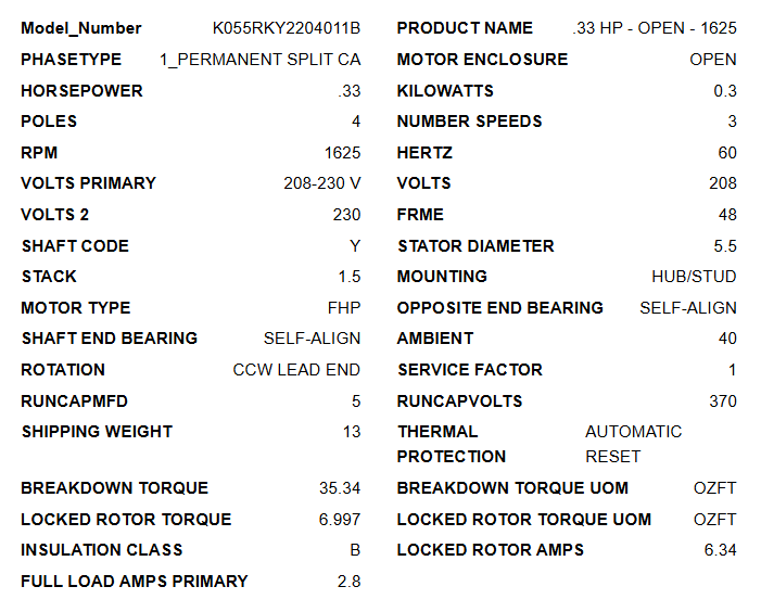 NA1034, 0.33Hp, 1625 RPM, 208-230V, 1Ph, Frame 48Y, ODP, K055RKY2204011B