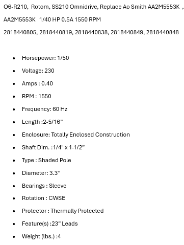 O6-R210 ROTOM, 1/50 HP, 230V, 0.4A, Replace AA2M5553K Ao Smith, SS210, Omnidrive, is backordered and will ship as soon as it is back in stock.
