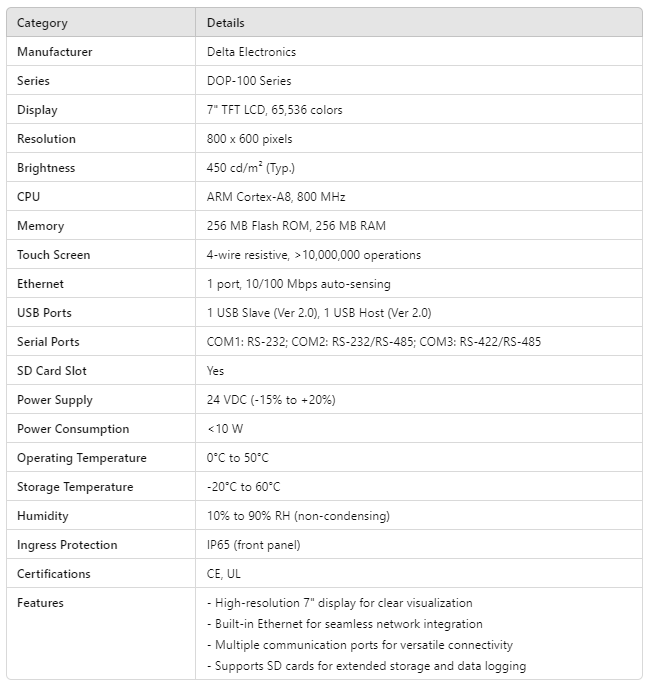 P-DOP-107EG, Dop-100 Series Hmi 7 Touch Screen, High Resolution, With Ethernet Port