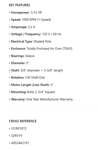 P01872, OEM Replacement, 1/12Hp, 1000 Rpm, 120 V, 60 Hz, CWSE, TEAO, 5" Dia.