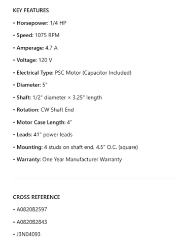 P4093, OEM Replacement, 1/4Hp, 1075 Rpm, 120 V, CWSE, 5" Dia.